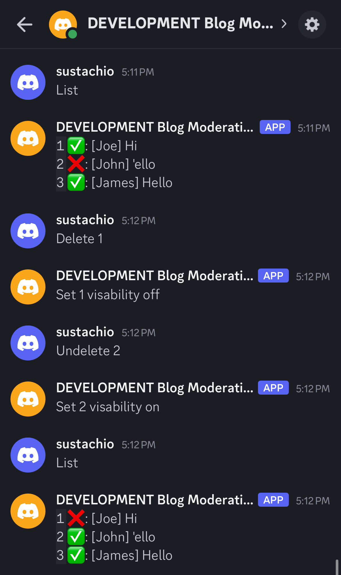 CommentsOne of my favorite things I've added is comments. I was actually also working on adding an ability to reply to others' comments but it has been stalled for a few months now. Every time a comment is posted I get a notification from a Discord bot that is running on the same Raspberry Pi hosting this blog. It gives me the option to remove the comment if it is from a bot (there are more of these than you'd think). I also have some very basic moderation commands built into the bot being list (lists all comments), delete [id] (hides comment), and undelete [id] (unhides comment). Each comment's id can be accessed from the HTML id on the element so they are easy to find. The default name for a comment is Anonymous + a random hexadecimal number from 0-4096 in order to sort out between multiple anonymous people (assuming someone would retype the random number). All of the comments are stored in an sqlite database. Below are some images demonstrating the new comments and discord bot (these are from the development bot which is identical but for the development server):