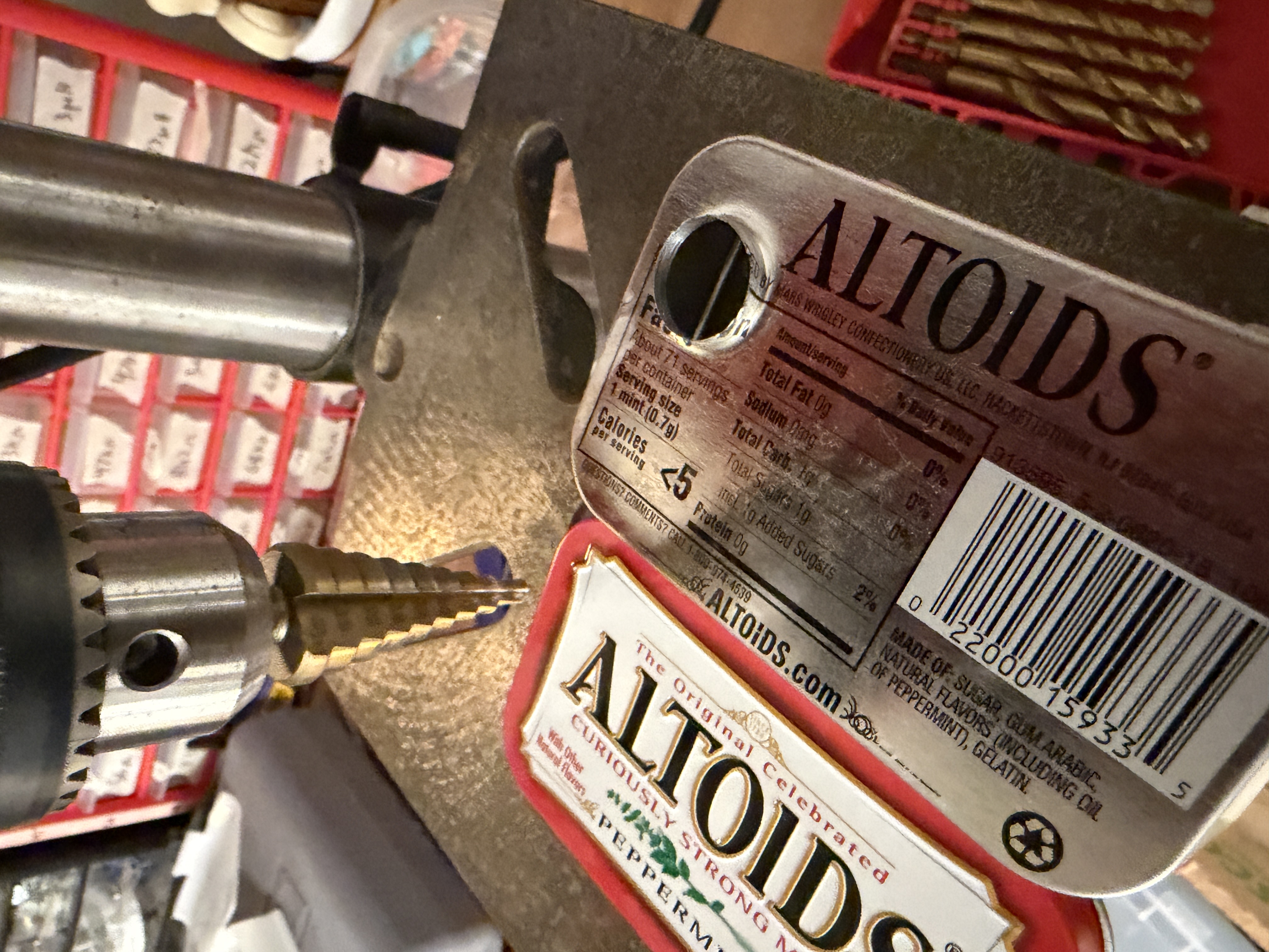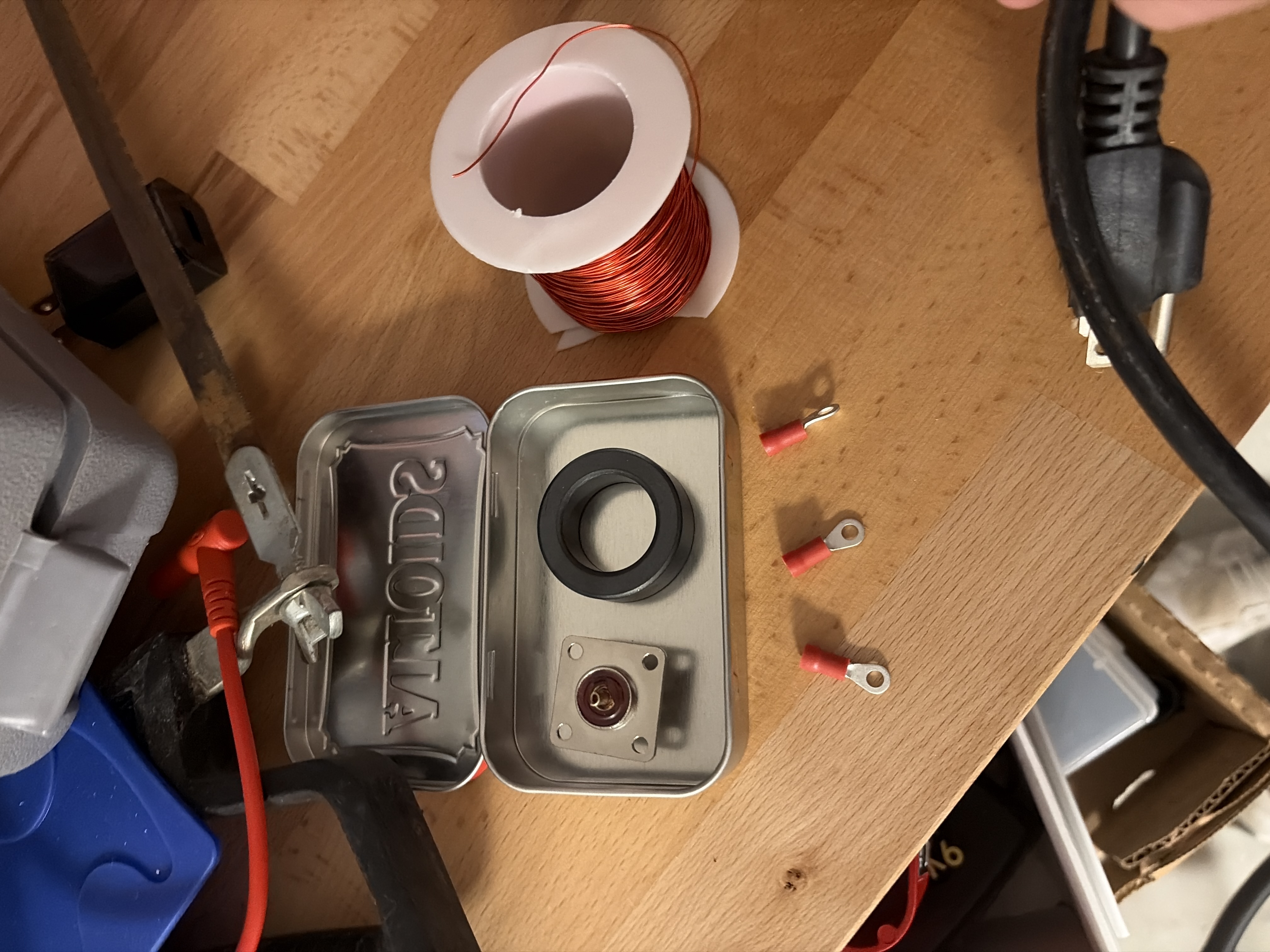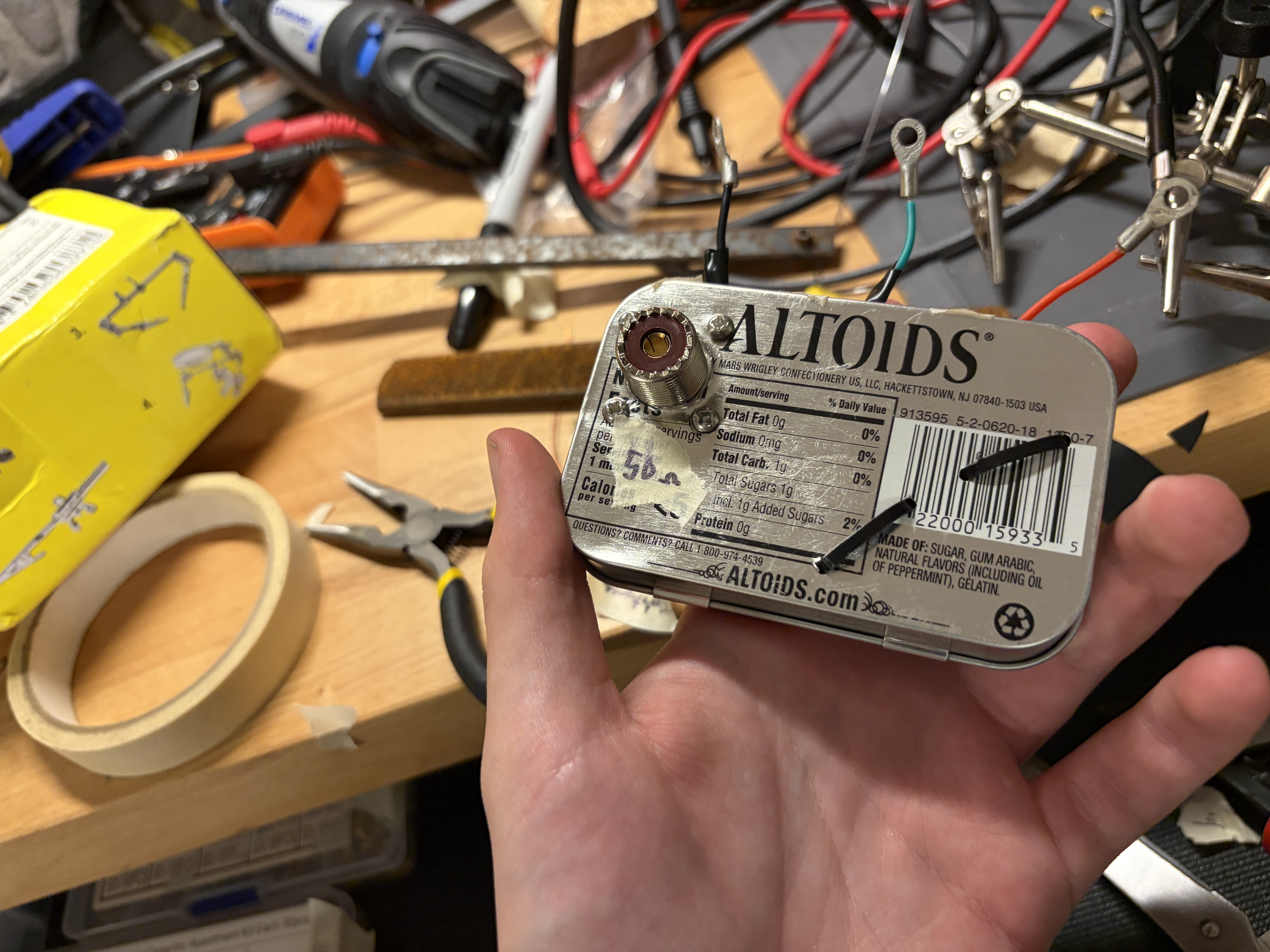 Electrical layout of the autotransformer ConstructionI had a stockpile of Altoids tins and wanted to try and fit one in here. I decided to use a FT140-43 toroid for the core (FT=ferrite, 140=1.4in OD, 43=mix type) as I typically operate from 40m-10m, but most toroids will do alright. My friend who had also build one of these had just used a random powdered iron toroid he had pulled out of an old audio amp. I had everything else in stock so this was a pretty easy project to get started on. I started by drilling the holes for the SO-239 UHF connector. I had to use a stepped drill bit for the first time which ended up just lifting the aluminium to the sides so I had to go over and cut that down with a Dremel.