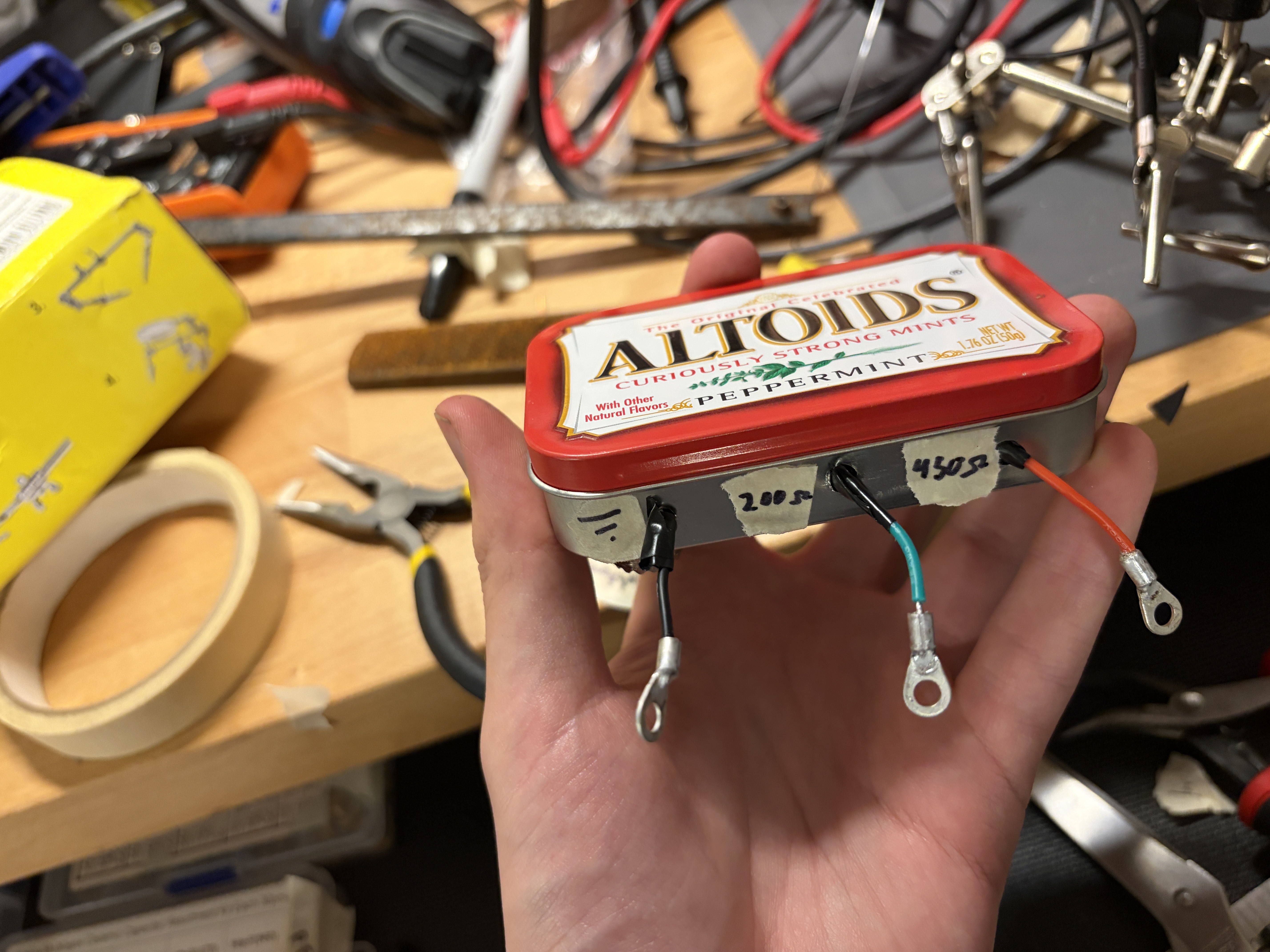 Testing + antennaAlthough I did not take pictures, I tested the response to 200 and 450 ohm resistors on the 4:1 and 9:1 terminals using a NanoVNA and it was able to match pretty spot on to 50 ohms for both. For the random wire antenna, you can use 35.5' or 16.5' wire for the main element and 6.5' or 3.5' wire for the counterpoise (in various configurations depending on your frequency and physical setup). I've been having good luck on 40m at night with the 35.5' sloped out of my window and the 6.5' wire sloped upwards in my room using the 450 ohm port, but you can play around with different combinations as seems fit. I've been able to get a couple dozen FT8 contacts using it over a couple of nights and have pushed it to 50W without any noticeable heating (I would recommend not going much above 30W for digital modes or 100W for SSB with the same FT140-43 core as I'm using in order to avoid damaging the core). You will likely need to use another impedance matcher after this to get a low enough SWR but this unit can get the initial impedance close enough to 50 ohms that it is relatively easy to match with a simple network or a radio's built-in ATU.