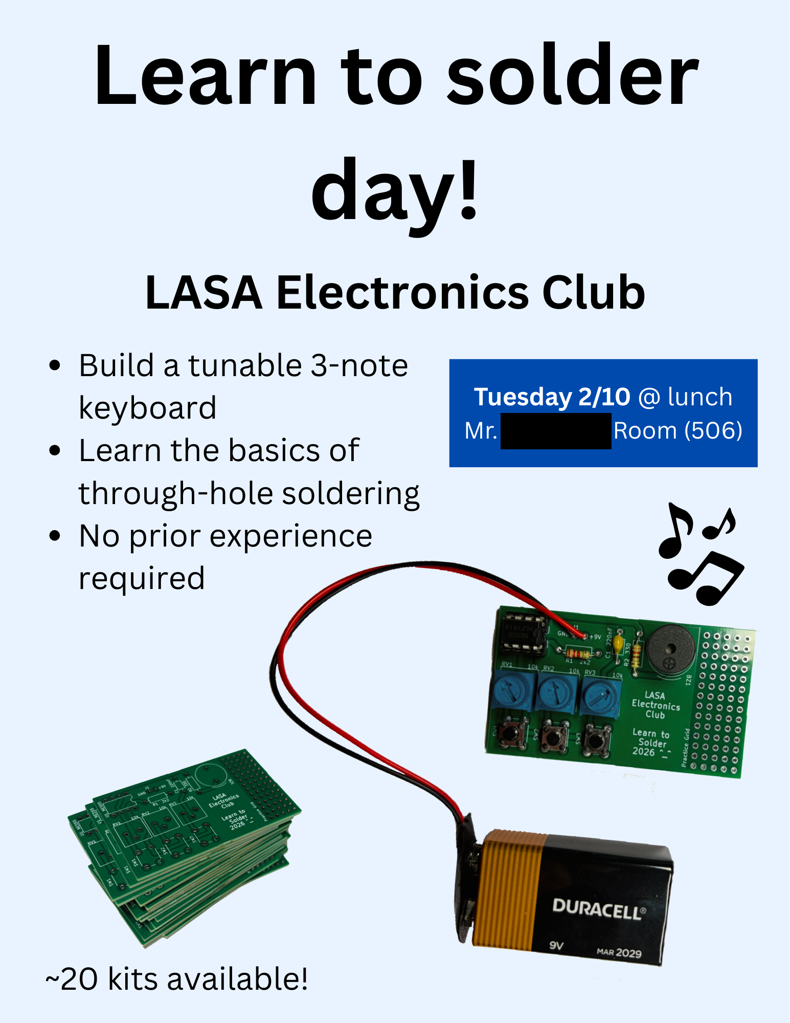 Newspaper Article: Hosting a Learn to Solder Day at LASA Electronics Club2026-2-28The following was a newspaper article I wrote for a local neighborhood newspaper about a learn to solder day which I hosted at my school using custom PCBs. Technical details are provided after the article. At the start of this year, I started a small Electronics Club at my school with some members of our school’s Amateur Radio Club. So far, we’ve mostly just been doing presentations on various components and topics, but I wanted to host a workshop where we taught people how to solder. Soldering is making electrical connections between components by melting a thin piece of metal alloy (known as “solder”) to attach two pieces of metal together. It is similar to welding, but on a much smaller scale and at much lower temperatures. Most of the soldering you do with electronics is soldering components, like LEDs, computer chips (known as ICs or integrated circuits), or resistors onto circuit boards. In order to solder, you need a soldering iron, which is a tool with a really hot tip, and solder, which you will melt with the soldering iron. I decided to create some simple circuit boards that people could solder components onto and have them do something. I designed a small 3-note musical keyboard with 3 little tactile buttons and knobs to change the pitch of each. Instead of a speaker, I put a spot for a buzzer on the board, which people would also have to solder onto. I designed the board using the program KiCad, which makes laying everything out very easy. If you’re interested in learning how to design circuit boards with KiCad, I would recommend Phil’s Lab on YouTube, he has a good tutorial series putting together a board for the STM32 microcontroller. Once I had the boards designed, I ordered them from the company JLCPCB in Hong Kong. It only cost $7.80 for 20 of them, which comes out to only $0.39 per board. Once I had all of the boards and components, I sent out an advertisement in Blend (the website our school uses for our online assignments). Surprisingly, we had more than 20 people show up at lunch, so some people had to share boards. I gave a quick presentation at the start explaining how to solder and then let people get all of the equipment they needed. Our club sponsor had a bucket of about 20 soldering irons that we were able to use. For the rest of the lunch block, people worked on the boards, and some other more experienced people and I walked around and helped folks out. By the end of lunch, about half of the people had finished and had working musical keyboards. I told the rest who hadn’t finished that they could come back during our next meeting to finish up their boards. Overall, the event seemed to have been a success. We had a good turnout, and a lot of people who had never soldered before got some good experience. I also got to design a circuit board, which is always fun to do. If you are interested in learning to solder yourself, there are tons of cheap kits online, and you can pick up a soldering iron from most hardware stores or online for around $20. You can buy kits for homemade radios, synthesizers (electronic music equipment), guitar pedals, headphone amplifiers, and all sorts of other things. If you don’t know what you’d like to do, you can just look up “solder project” on AliExpress or a similar Chinese shopping site and find something cheap. Once you get the basics down, you can learn to read electronics schematics and can make just about any circuit you can find online on prototyping boards, which is a great way to get into electronics as a whole.