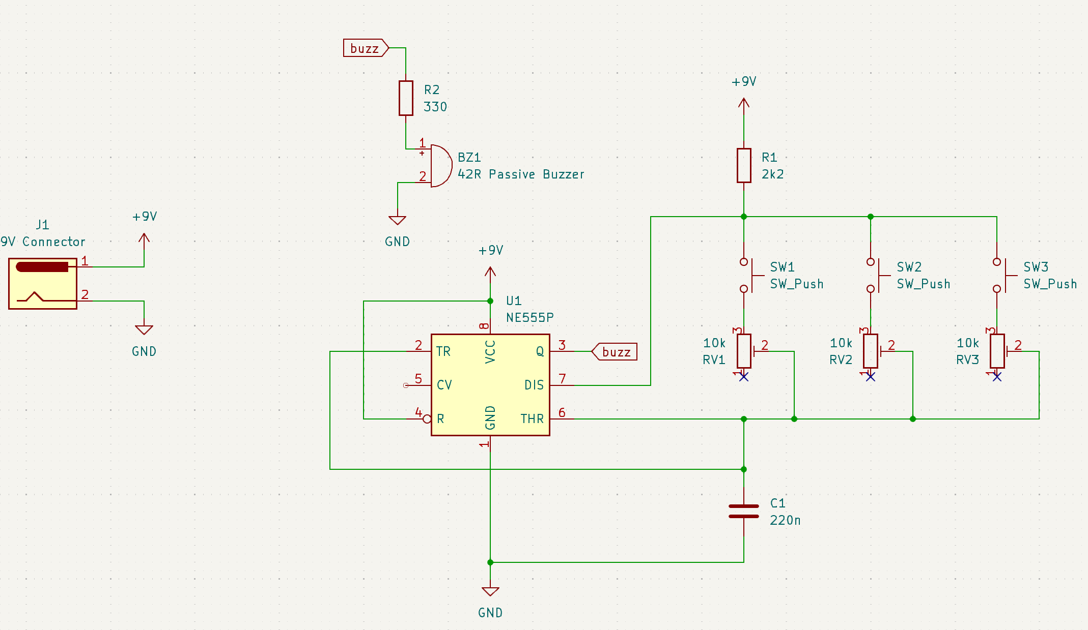 Technical detailsNot a part of the newspaper article. The circuit itself is a very simple TLC555 astable oscillator circuit with its output hooked up to a small buzzer. In order for the keyboard to work, three buttons were placed in series with potentiometers which were in turn connected to a capacitor, allowing you to change how much current and therefore how quickly the capacitor could charge and discharge. The whole circuit was designed to be powered off of a 9V battery, but it would have operated off of anywhere from 2-15V. The hole sizes spacing for the buzzer was slightly off, but you could bend the pins easily enough.