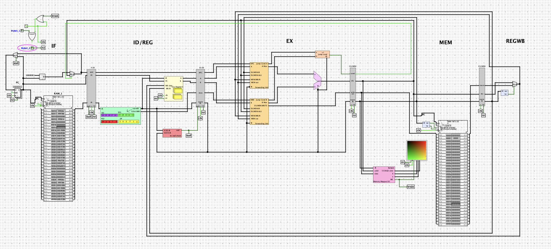 RISC Processor, Custom ISA, and compiler2026-4-4Over spring break, I put together a simple 32 bit RISC (reduced instruction set computer) processor using Logisim in order to follow along with the architecture described in the book Computer Architecture: A Quantitative Approach. Since the goal was primarily to study higher level computer architecture, not every component was built from logic gates and I made heavy use of the built in multiplexers. To have something to run on the processor, I also wrote a compiler for a custom object oriented programming language which compiles down to an intermediate language based on the stack based VM from the Nand2Tetris series. I implemented a second compiler which will go from this intermediate language down to my own assembly language.