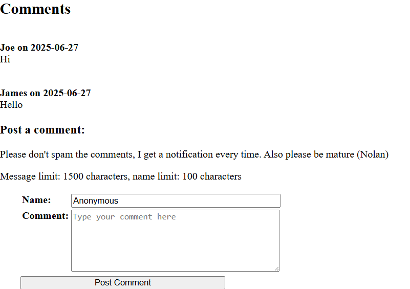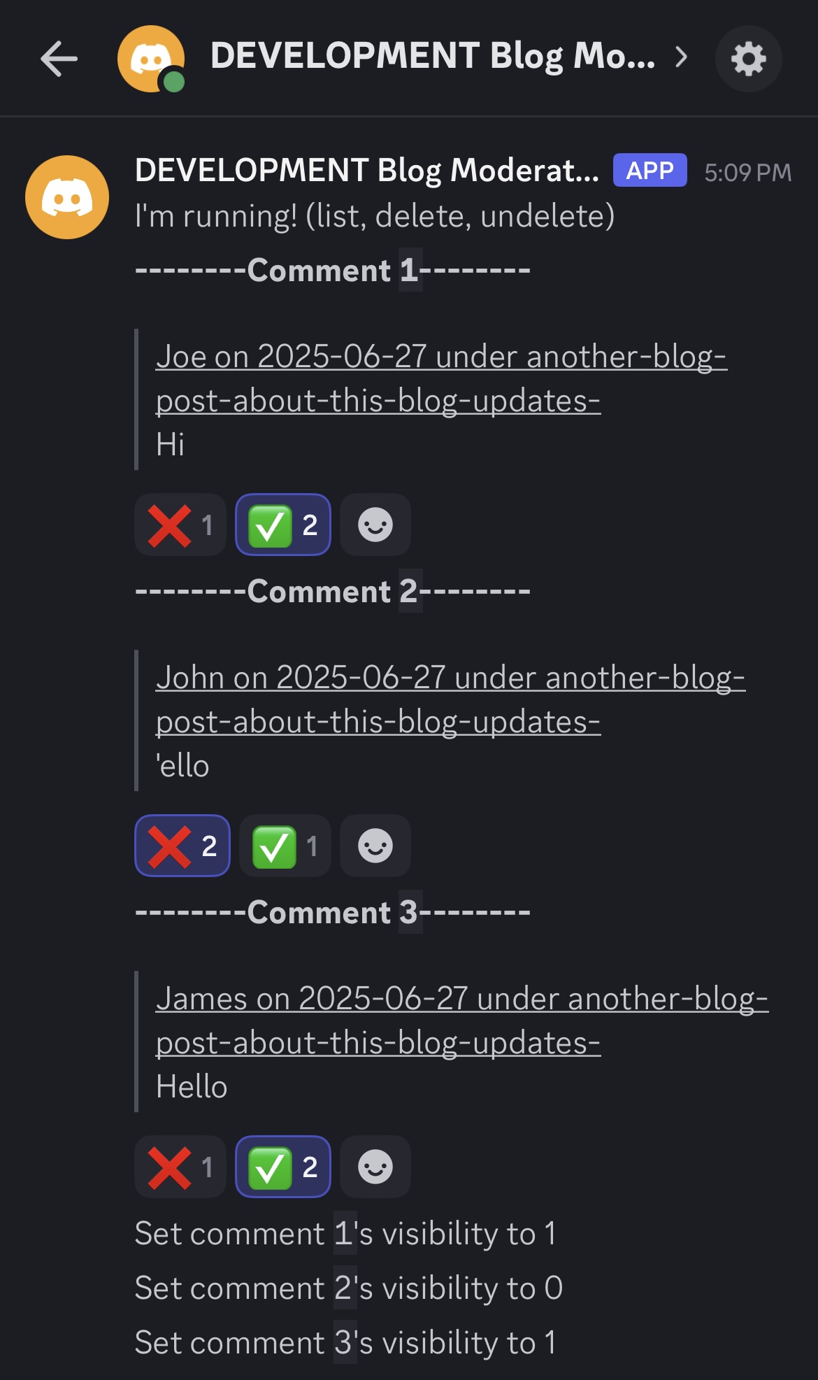 CommentsOne of my favorite things I've added is comments. I was actually also working on adding an ability to reply to others' comments but it has been stalled for a few months now. Every time a comment is posted I get a notification from a Discord bot that is running on the same Raspberry Pi hosting this blog. It gives me the option to remove the comment if it is from a bot (there are more of these than you'd think). I also have some very basic moderation commands built into the bot being list (lists all comments), delete [id] (hides comment), and undelete [id] (unhides comment). Each comment's id can be accessed from the HTML id on the element so they are easy to find. The default name for a comment is Anonymous + a random hexadecimal number from 0-4096 in order to sort out between multiple anonymous people (assuming someone would retype the random number). All of the comments are stored in an sqlite database. Below are some images demonstrating the new comments and discord bot (these are from the development bot which is identical but for the development server):