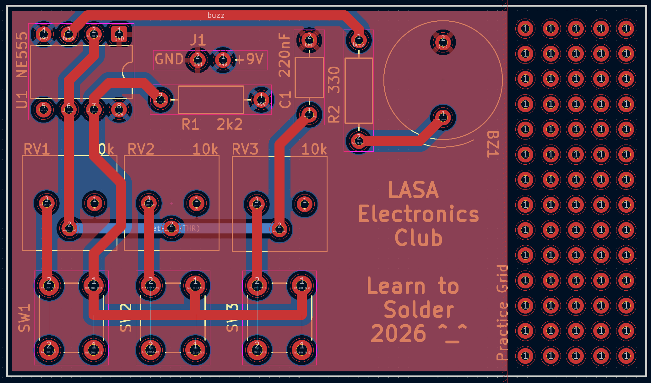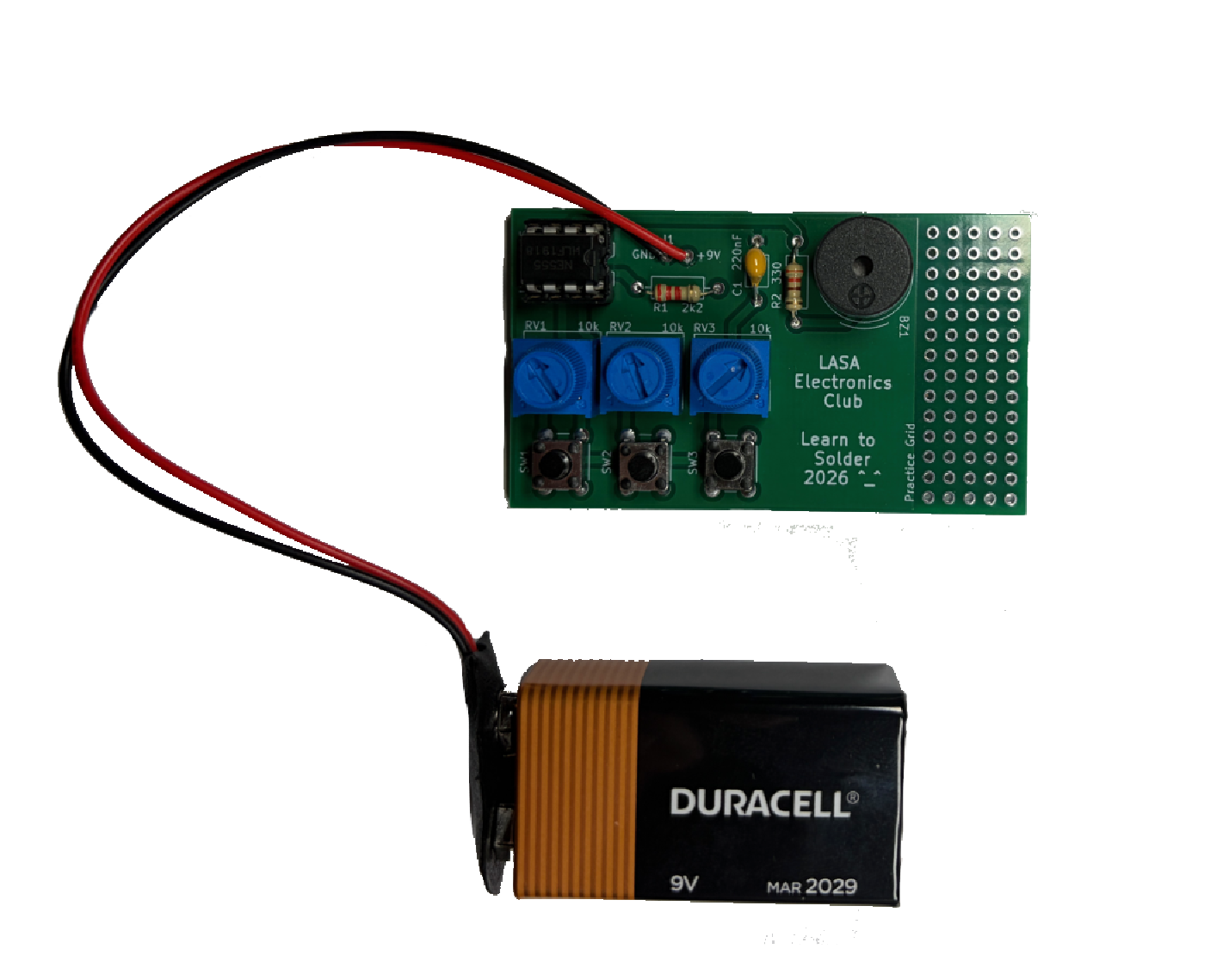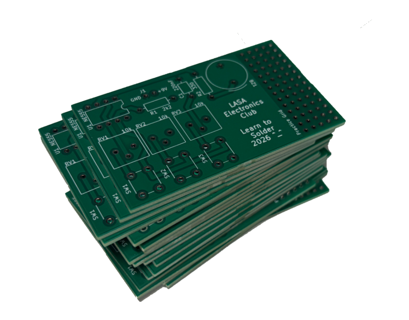 Newspaper Article: Hosting a Learn to Solder Day at LASA Electronics Club2026-2-28The following was a newspaper article I wrote for a local neighborhood newspaper about a learn to solder day which I hosted at my school using custom PCBs. Technical details are provided after the article. At the start of this year, I started a small Electronics Club at my school with some members of our school’s Amateur Radio Club. So far, we’ve mostly just been doing presentations on various components and topics, but I wanted to host a workshop where we taught people how to solder. Soldering is making electrical connections between components by melting a thin piece of metal alloy (known as “solder”) to attach two pieces of metal together. It is similar to welding, but on a much smaller scale and at much lower temperatures. Most of the soldering you do with electronics is soldering components, like LEDs, computer chips (known as ICs or integrated circuits), or resistors onto circuit boards. In order to solder, you need a soldering iron, which is a tool with a really hot tip, and solder, which you will melt with the soldering iron. I decided to create some simple circuit boards that people could solder components onto and have them do something. I designed a small 3-note musical keyboard with 3 little tactile buttons and knobs to change the pitch of each. Instead of a speaker, I put a spot for a buzzer on the board, which people would also have to solder onto. I designed the board using the program KiCad, which makes laying everything out very easy. If you’re interested in learning how to design circuit boards with KiCad, I would recommend Phil’s Lab on YouTube, he has a good tutorial series putting together a board for the STM32 microcontroller. Once I had the boards designed, I ordered them from the company JLCPCB in Hong Kong. It only cost $7.80 for 20 of them, which comes out to only $0.39 per board. Once I had all of the boards and components, I sent out an advertisement in Blend (the website our school uses for our online assignments). Surprisingly, we had more than 20 people show up at lunch, so some people had to share boards. I gave a quick presentation at the start explaining how to solder and then let people get all of the equipment they needed. Our club sponsor had a bucket of about 20 soldering irons that we were able to use. For the rest of the lunch block, people worked on the boards, and some other more experienced people and I walked around and helped folks out. By the end of lunch, about half of the people had finished and had working musical keyboards. I told the rest who hadn’t finished that they could come back during our next meeting to finish up their boards. Overall, the event seemed to have been a success. We had a good turnout, and a lot of people who had never soldered before got some good experience. I also got to design a circuit board, which is always fun to do. If you are interested in learning to solder yourself, there are tons of cheap kits online, and you can pick up a soldering iron from most hardware stores or online for around $20. You can buy kits for homemade radios, synthesizers (electronic music equipment), guitar pedals, headphone amplifiers, and all sorts of other things. If you don’t know what you’d like to do, you can just look up “solder project” on AliExpress or a similar Chinese shopping site and find something cheap. Once you get the basics down, you can learn to read electronics schematics and can make just about any circuit you can find online on prototyping boards, which is a great way to get into electronics as a whole.