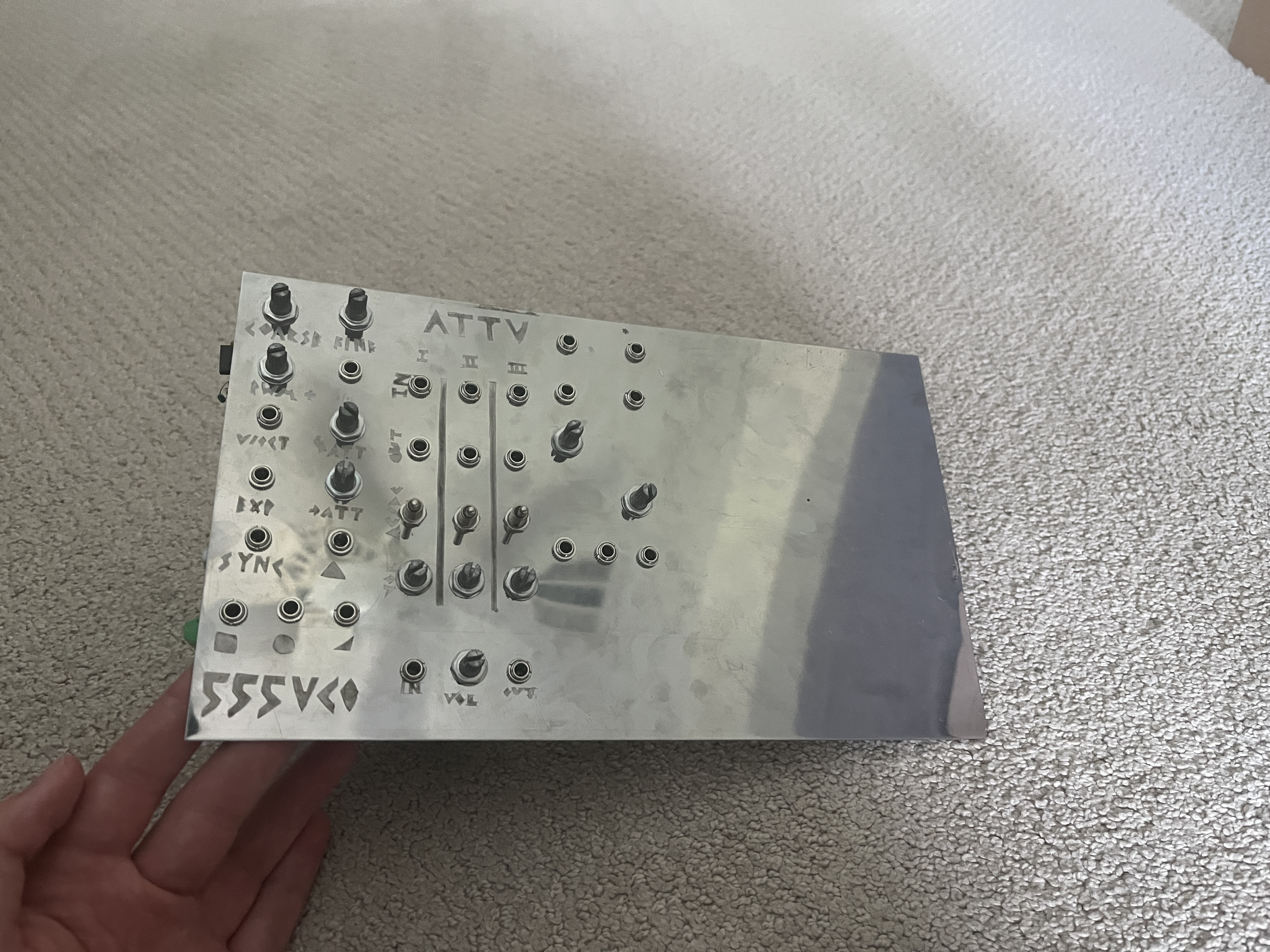 Front panel of the start of my modular synth, so far a VCO, an Attenuverter, and a VCF (lettering not yet etched in front) (separate +/-12V module)
